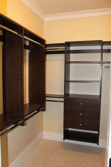 WOOD CLOSET ORGANIZERS WITH DRAWERS, SHELVES AND HANGS